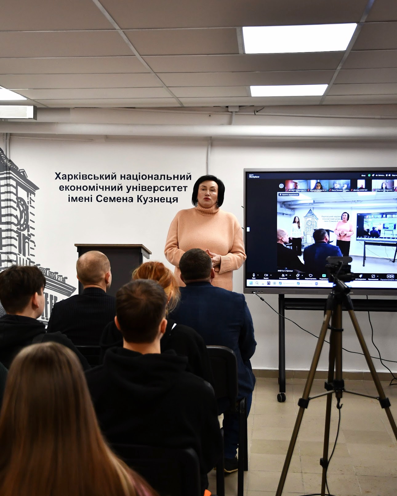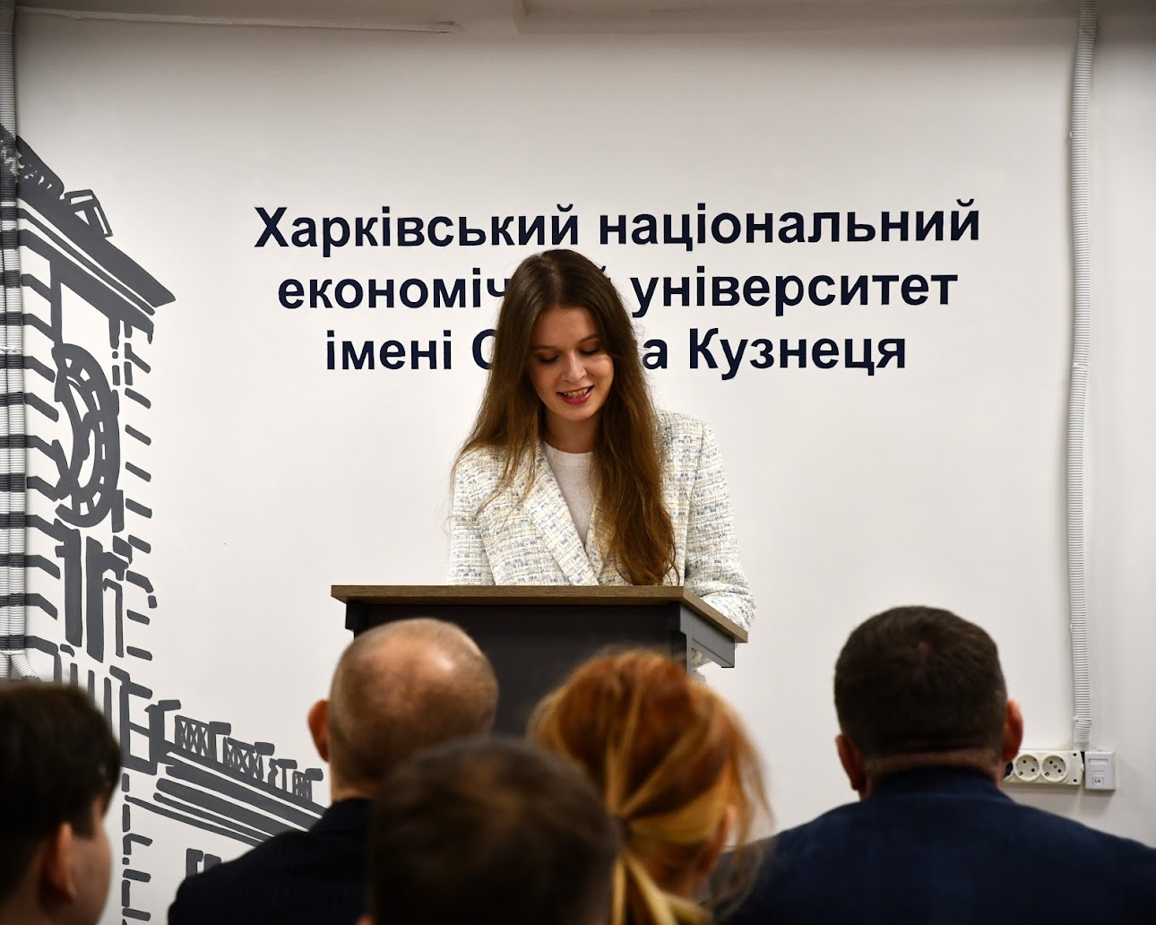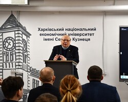 З вітальним словом також виступив в. о. ректора ХНЕУ ім. С. Кузнеця Володимир Пономаренко, підкресливши роль університету як платформи для формування лідерських, аналітичних і громадянських компетентностей учнів, а також значення співпраці освіти й міської громади у відбудові та розвитку Харкова.