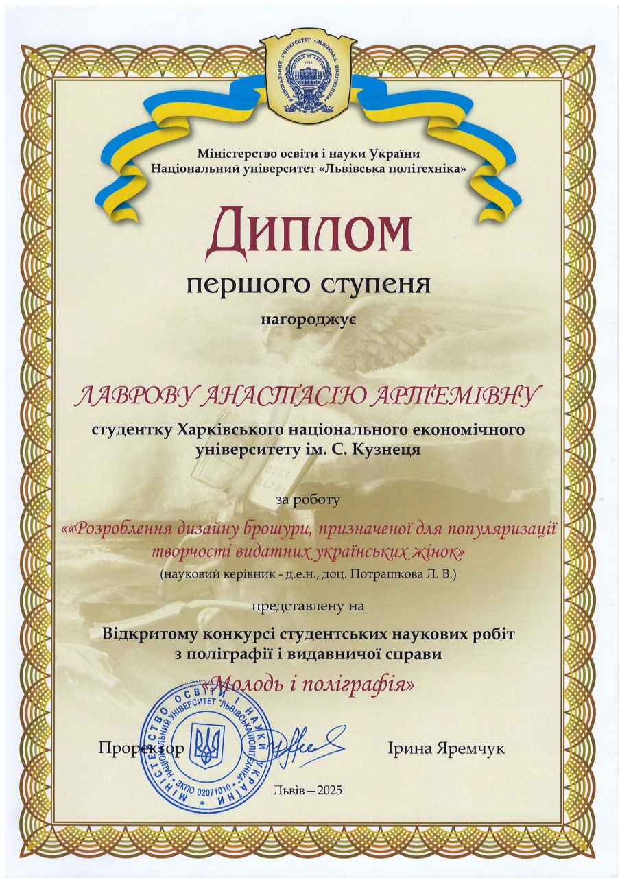 Лаврова Анастасія, студентка 4 курсу нашої бакалаврської освітньої програми, посіла І місце у Всеукраїнському конкурсі студентських наукових робіт із поліграфії та видавничої справи «Молодь і поліграфія».