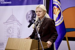 Ректор ХНЕУ ім. С. Кузнеця Тетяна Шталь у своєму виступі наголосила на особливій ролі університету в розвитку освіти та молодіжних ініціатив у прифронтовому Харкові.