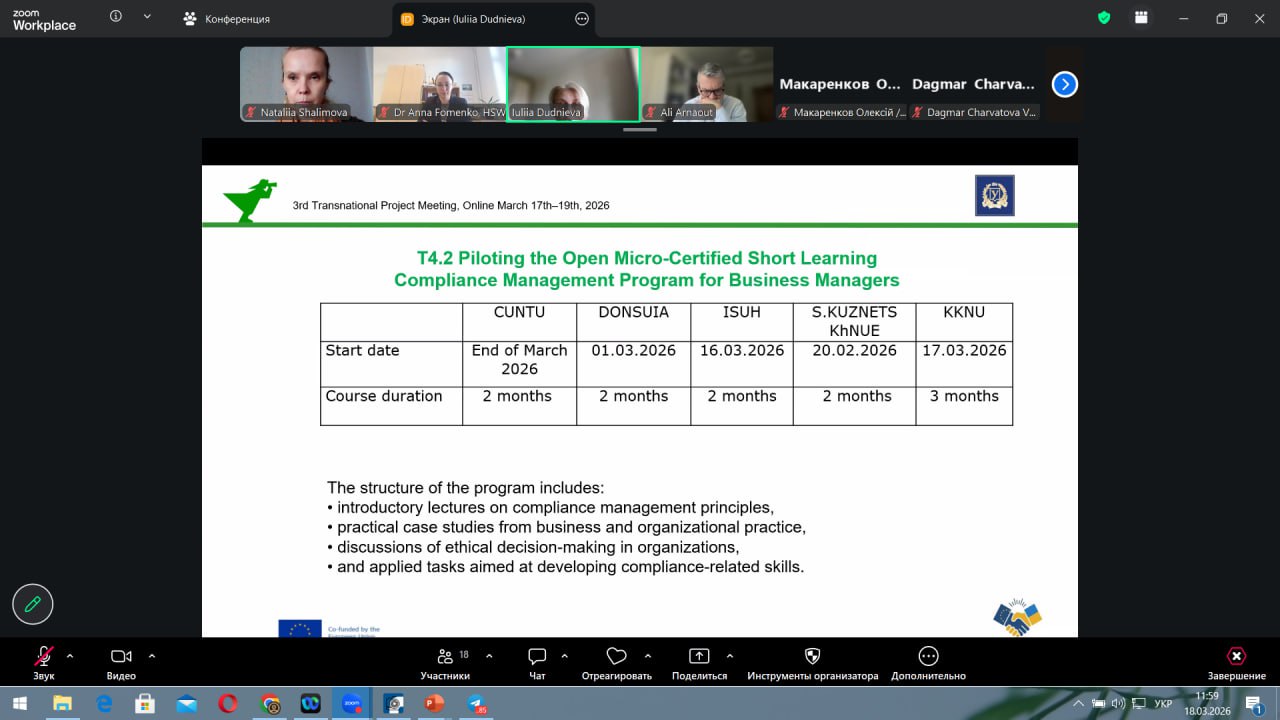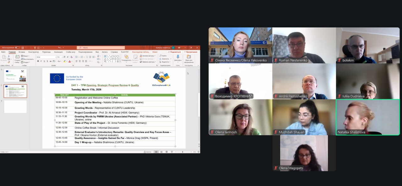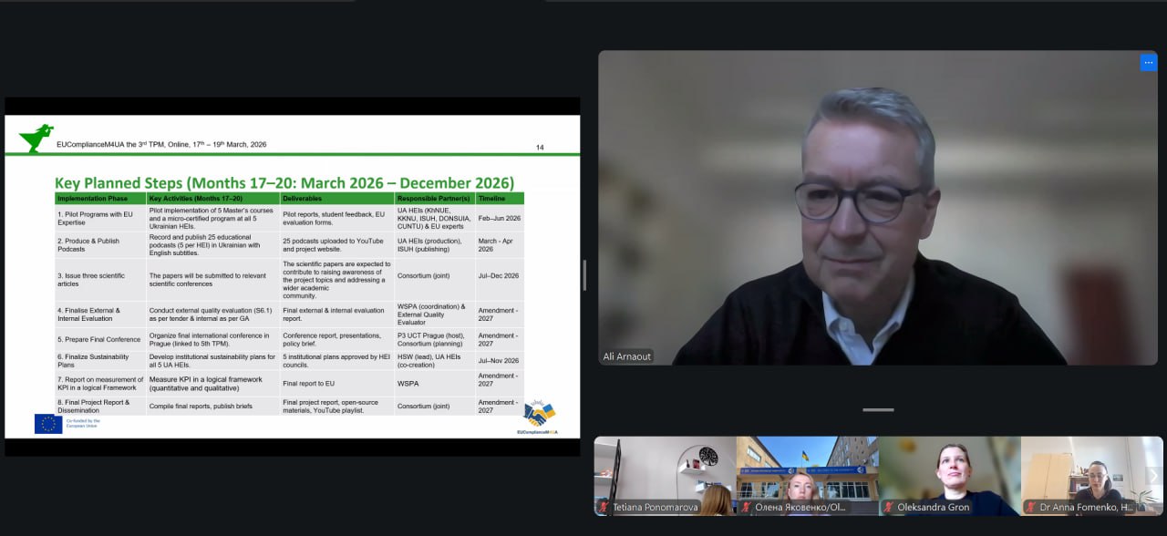 Третя транснаціональна зустріч партнерів проєкту EUComplianceM4UA (Erasmus+) — 3rd Transnational Project Meeting (TPM3) — відбулася 17–19 березня 2026 року в онлайн-форматі.