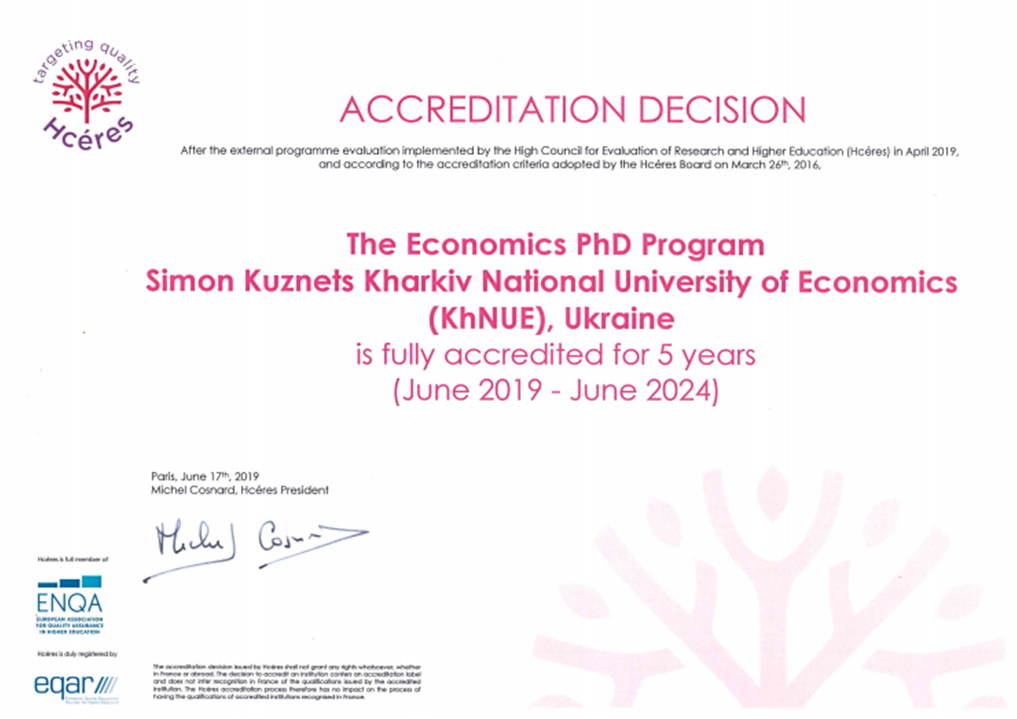 Відповідність підготовки здобувачів ступеня доктора філософії міжнародним стандартам якості вищої освіти підтверджено на засіданні експертної ради Hcéres, яке відбулося 17.06.2019 р., на якому прийнято рішення про надання акредитації (Fully accredited) освітньо-науковій програмі підготовки здобувачів ступеня доктора філософії (ОНП) «Економіка» на третьому (освітньо-науковому) рівні вищої освіти у Харківському національному економічному університет імені Семена Кузнеця на 5 років (june 2019 – june 2024).